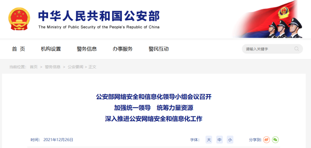 12月25日,公安部網(wǎng)絡(luò)安全和信息化領(lǐng)導(dǎo)小組會議召開。國務(wù)委員、公安部部長、部網(wǎng)絡(luò)安全和信息化領(lǐng)導(dǎo)小組組長趙克志主持會議并發(fā)表講話。會議強(qiáng)調(diào),要深入貫徹落實(shí)習(xí)近平總書記關(guān)于網(wǎng)絡(luò)安全和信息化工作的重要指示精神,增強(qiáng)“四個(gè)意識”、堅(jiān)定“四個(gè)自信”、做到“兩個(gè)維護(hù)”,加強(qiáng)統(tǒng)一領(lǐng)導(dǎo),統(tǒng)籌力量資源,進(jìn)一步推進(jìn)公安網(wǎng)絡(luò)安全和信息化工作,更好履行新時(shí)代黨和人民賦予的職責(zé)使命。